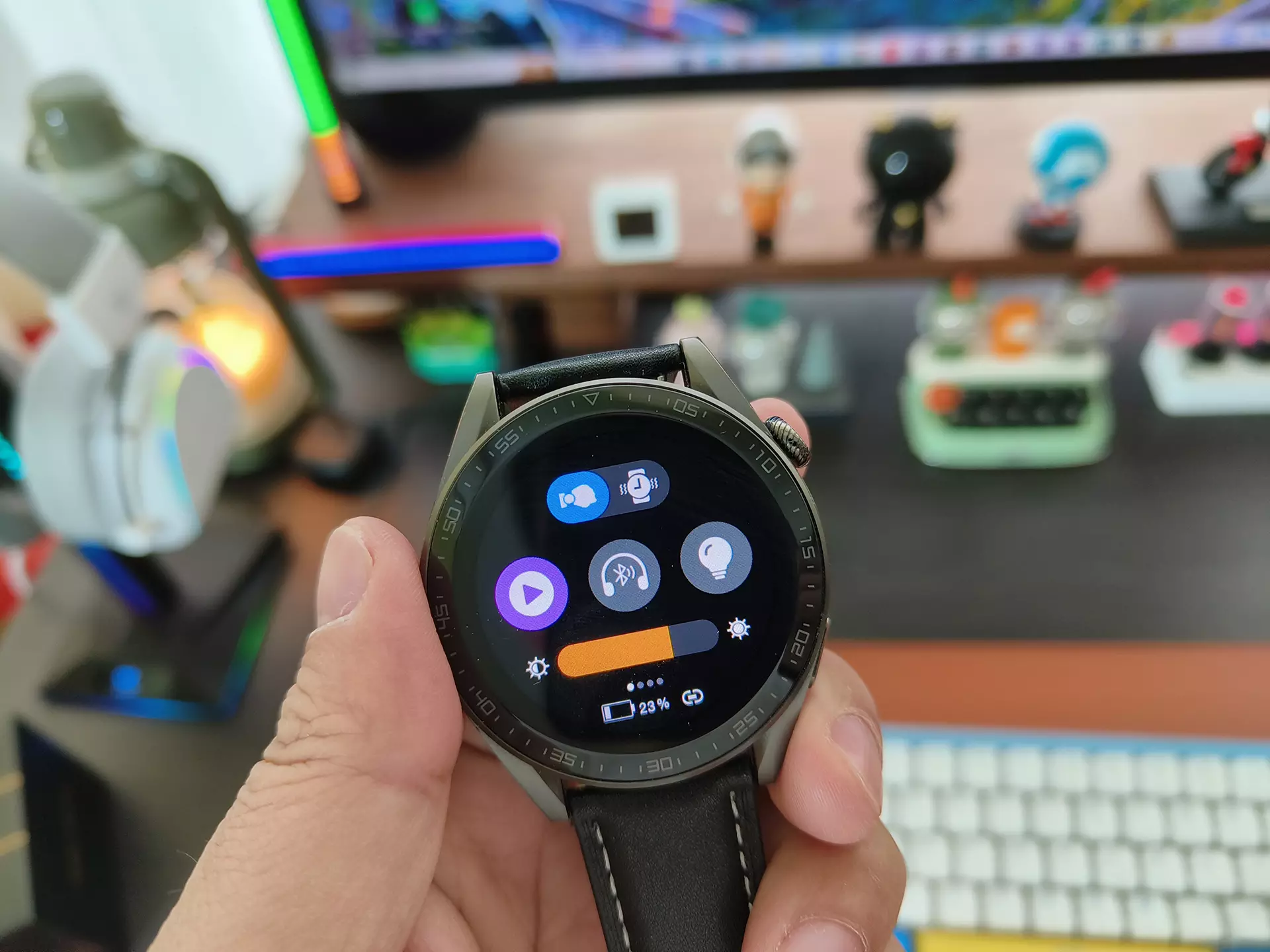 dido G30S智能手表采用磁吸无线充电方式,这种充电方式的优势在于不用担心金属触点会氧化,以及偶尔充不进电的问题。另外,这款手表支持iP67级防水,还内置排水功能,下滑状态栏就可以切换出这个功能,无论是日常使用洗手,或者浅水游泳都无需取下,免去了不少麻烦。不过个人建议游戏时还是换上赠送的硅胶材质的表带,这样不会对皮质表带有伤害。
