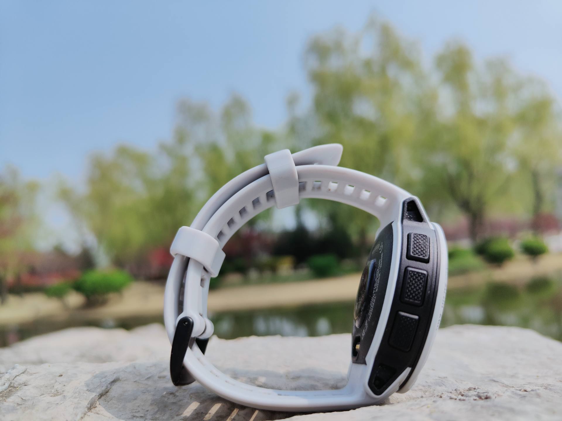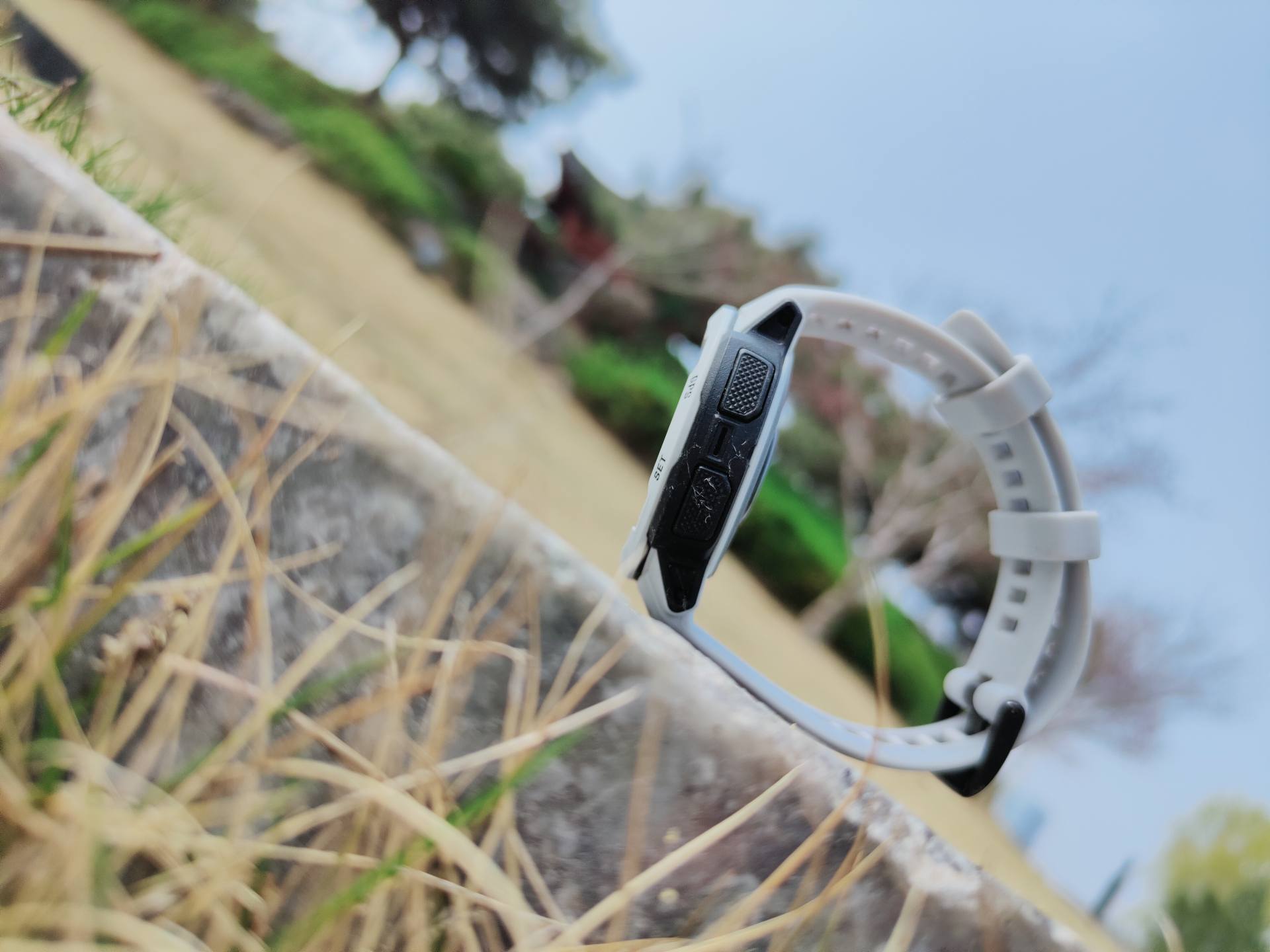 53克的重量,14.2mm的厚度,45mm的表径,比起很多智能手表都要来的轻便,还有40mm的本能Instinct 2S可以选择。配合布满扣眼的软质硅胶表带,佩戴舒适性很不错,透气性也有保障,双表扣有契合扣眼的凸起,可以与表带上的扣眼配合,防止运动过程中移位。