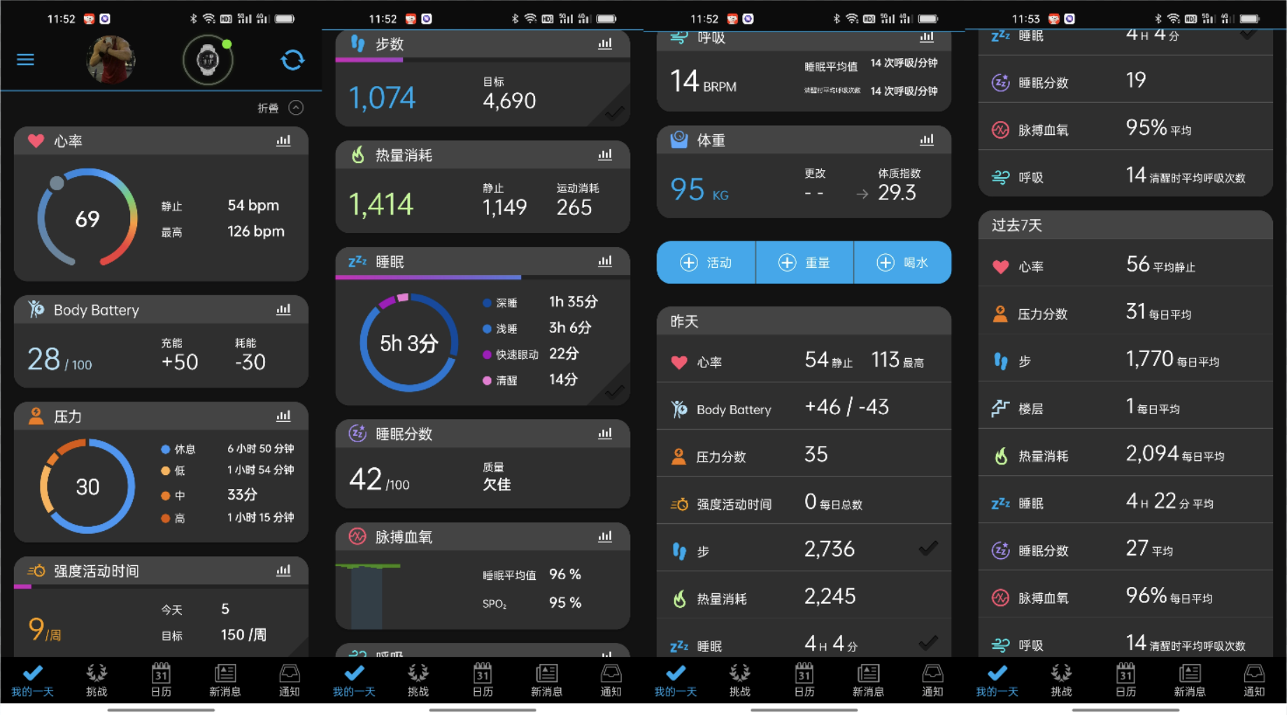 运动监测这块向来是佳明的强项,不论是曾经非智能时代的运动户外手表,还是如今的智能运动手表,佳明在这块的精准度和权威性都是毋庸置疑的。在APP上佳明对这快的重视也有所体现,因为运动数据永远会处于APP首页的最前方。