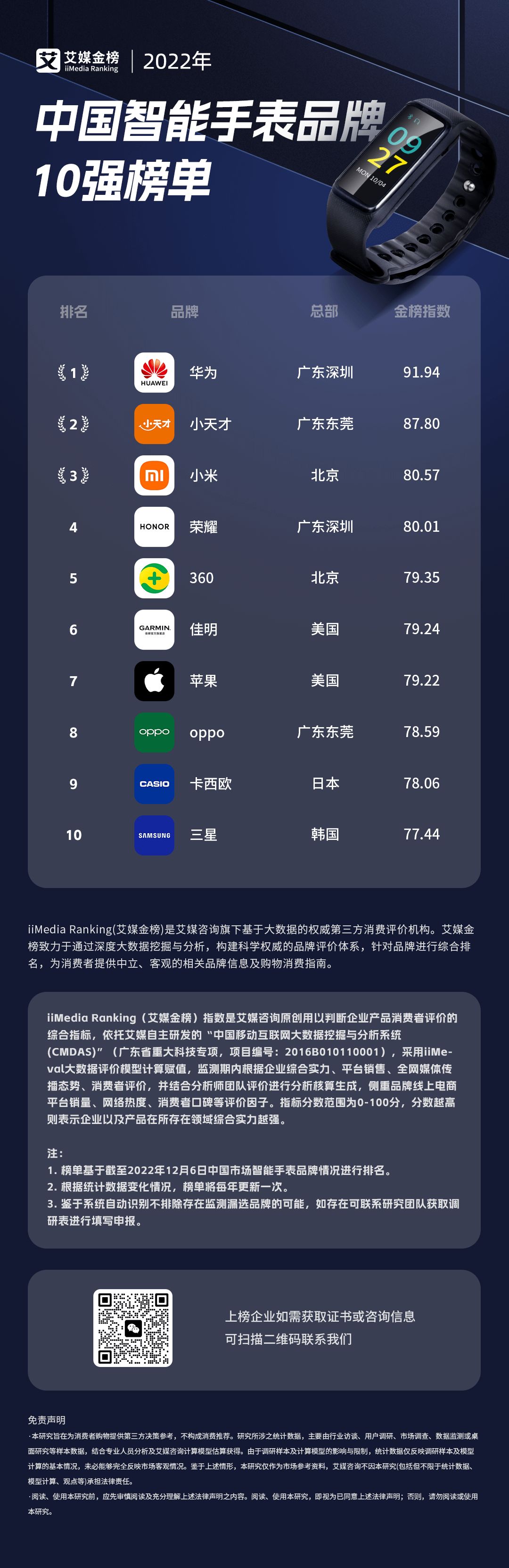 iiMedia Ranking(艾媒金榜)最新发布《2022年中国智能手表品牌10强榜单》,以反映2022年中国市场上的智能手表品牌排名情况。