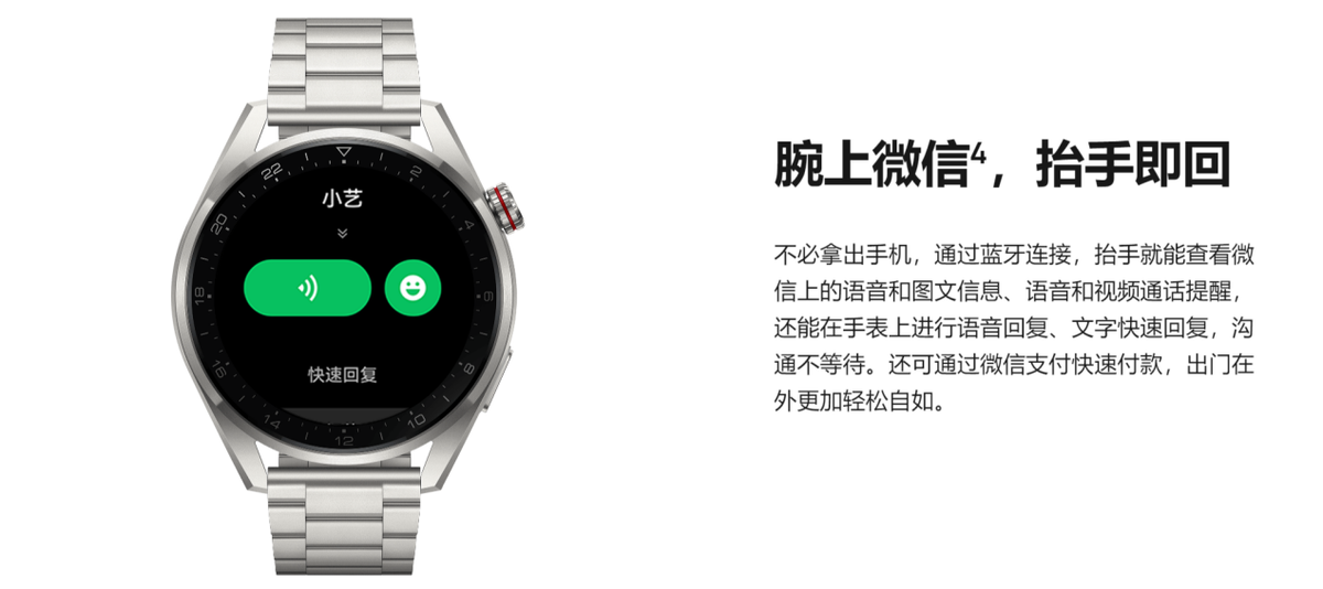 华为WATCH 3及华为WATCH 3 Pro new均迎来了重磅升级,支持了手表版微信[3],不必拿出手机,通过蓝牙连接,抬手就能查看微信上的语音和图文信息、语音和视频通话提醒,还能在手表上进行语音回复、文字快速回复,沟通不等待。还可通过微信支付快速付款,出门在外更加轻松自如。再也不用一直拿着手机看,实际使用更加方便。