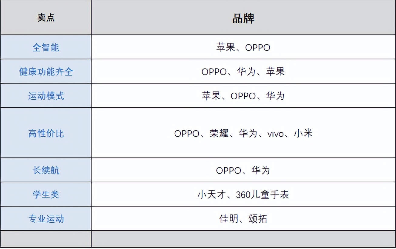 其它方面,追求高性价比可以选择小米、荣耀、OPPO、vivo、华为等智能手表,而如果是注重续航OPPO手表是首选。另外,对于低龄层儿童来说,功能不宜过多,选择小天才、360儿童手表之类比较合适,专注运动类的佳明、颂拓是首选,但价格略贵。此外,这个行业有一个明显趋势,那就是智能手表也开始从分功能类别到功能“大一统”的思路升级变化。其中最具代表的厂商有苹果、OPPO、华为等厂商。