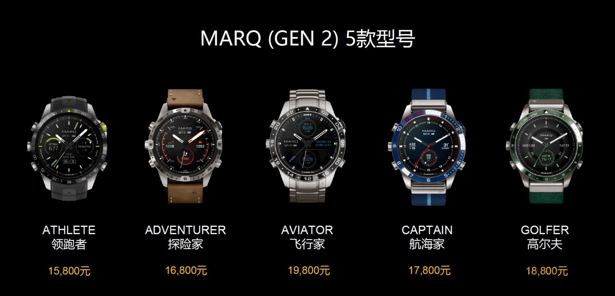 目前,佳明MARQ(Gen 2)共有5款细分型号可供选择,分别为领跑者 MARQ Athlete、探险家 MARQ Adventurer、高尔夫MARQ Golfer、航海家 MARQ Captain 以及飞行家 MARQ Aviator ,对应运动、户外探险、高尔夫、航海和飞行。每款型号在外观设计上独具匠心,结合使用场景提供不同材质表带,并将各领域独有的实用功能融入各款产品之中。