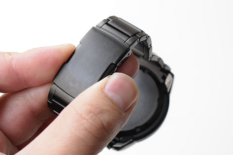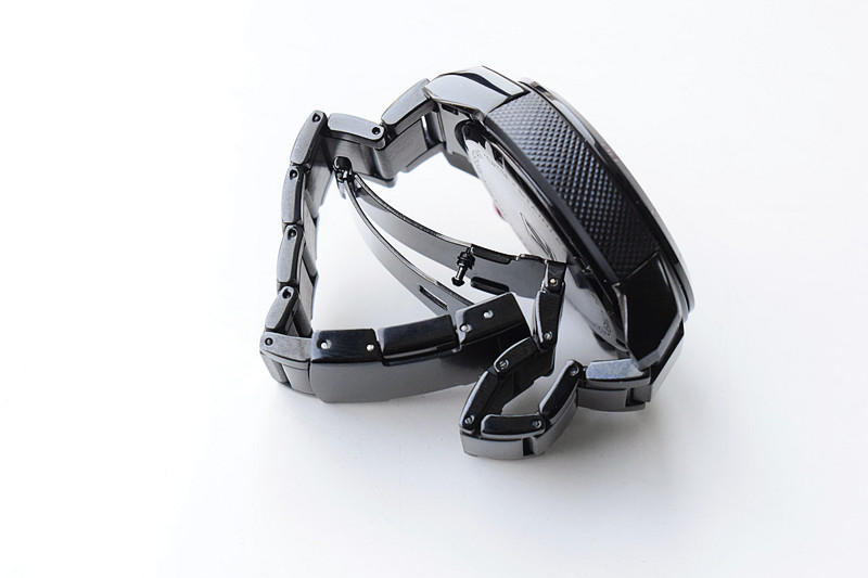 表带为实心不锈钢散珠表带,黑色的拉丝表面与表盘保持一致。环扣处并非分离式设计,而是龟背扣表带,单手两根手指轻压即可解锁。