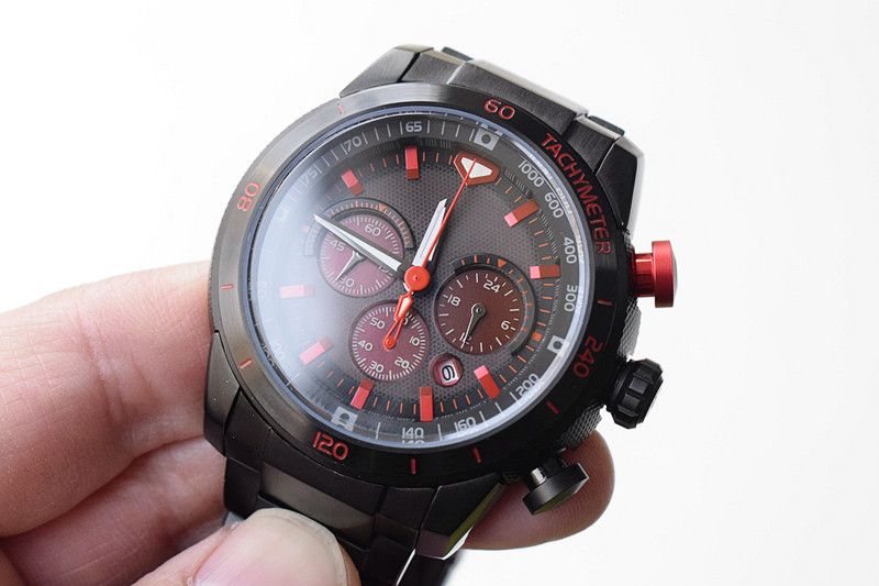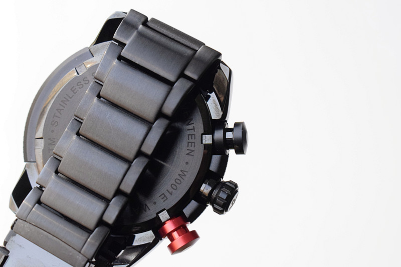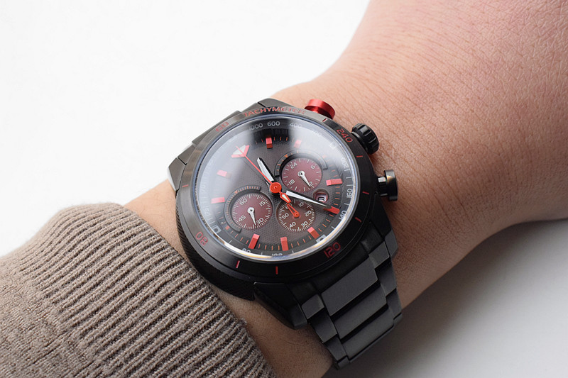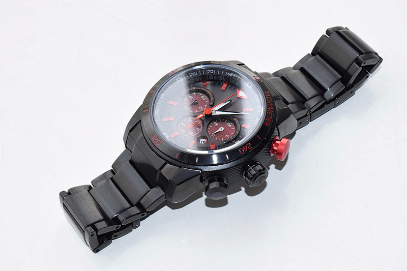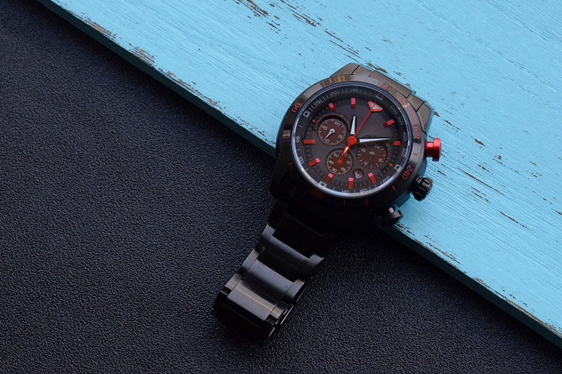 佩戴效果展示:佩戴贴合舒适,金属质感所带来的硬朗范儿显得阳刚味正浓。乌黑发亮的精钢表带搭配表盘上的红色刻度、秒针与表冠,即有内敛沉稳,又富张扬活力。而当光线稍暗,手表指针便会发出荧荧绿光,美观漂亮。