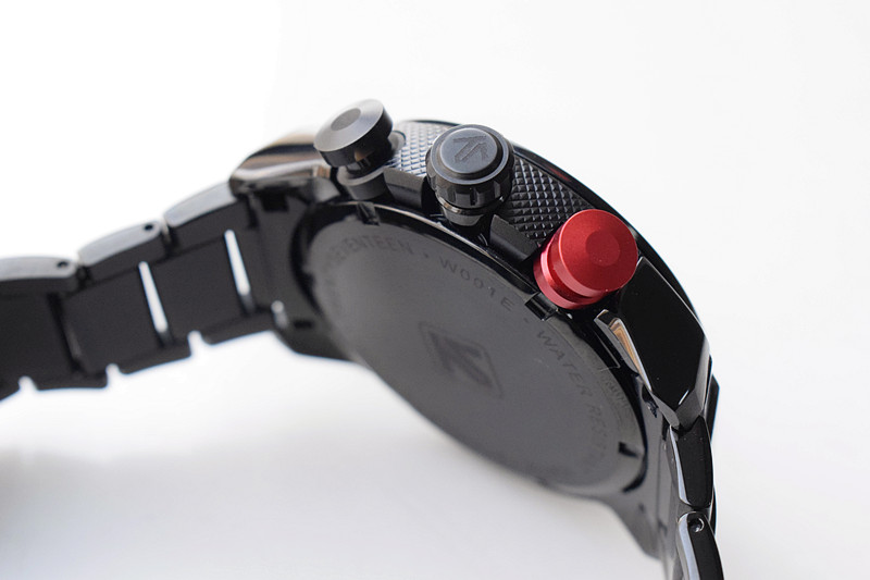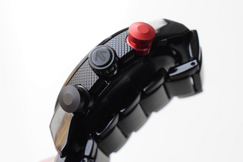 表盘右侧的三个表冠一字排开,每个都有着独立的控制功能。最醒目的红色可以当“秒表”使,正中的表冠为两段式,第一节设定时间,第二节调整日历。最下方的按键则为复位键。相信经常戴表的朋友对这些功能应当都很熟悉了。此外,细看表盘机身左右会发现一圈细密的“金字塔”纹。好看的同时也增加了摩擦力度。