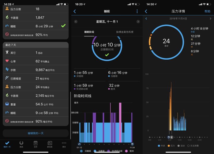 经过一天的运(zhe)动(mo),佳明的 App「Garmin Connect」都会有一个总结,你可以快速了解自己每天各项数值的详细情况。尤其这个压力真的很真实,上班的时候当我挤着「死亡三号线」,那个「压力」(物理上)的确是很高啊。