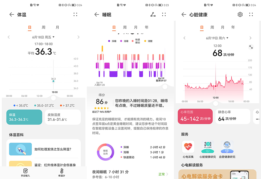 大多数消费者购买智能手表基本都是奔着运动健康而去,在这方面HUAWEI WATCH 3可以说是非常全面全能了。健康方面,这款手表除了支持心率检测、睡眠检测,还支持洗手检测、跌倒检测、连续血氧监测、心脏健康研究、血糖检测以及体温检测。不过血糖监测需要与第三方的血糖仪配套使用。