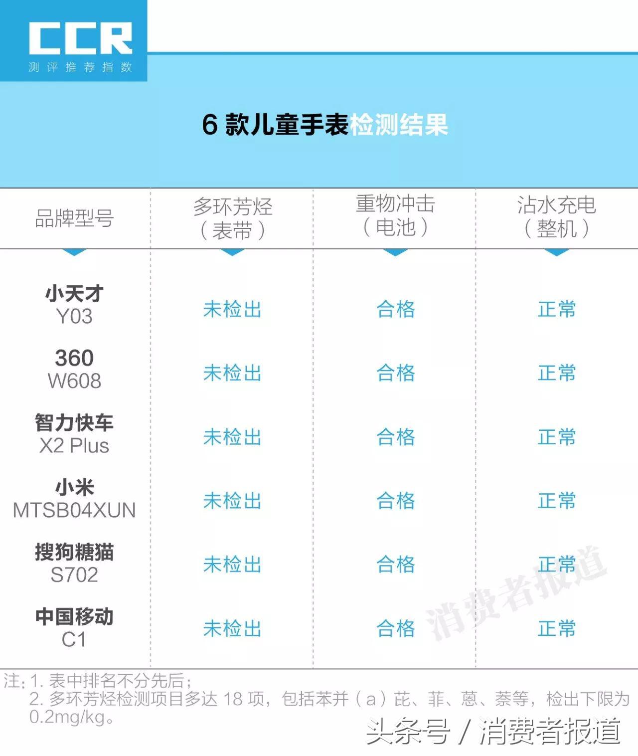 检测机构并未在6款产品的表带上检出18种多环芳烃;6款产品的电池经过重物冲击实验后,不起火,不爆炸;整机沾水后充电,表现正常。