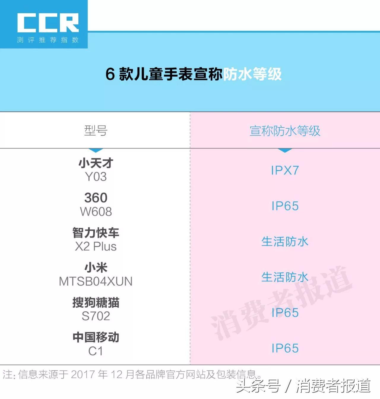 根据国家标准GB 4208-2008《外壳防护等级(IP代码)》的描述,消费者可以参考包装上的IP等级(IP后的第二个数字)对产品的防水性能进行判断。以本次测评的360 W608儿童电话手表标称的“IP65”为例,“5”代表“可防止喷水”;再以小天才 Y03上的“IPX7”为例,“7”代表“可防止短时间浸水”。