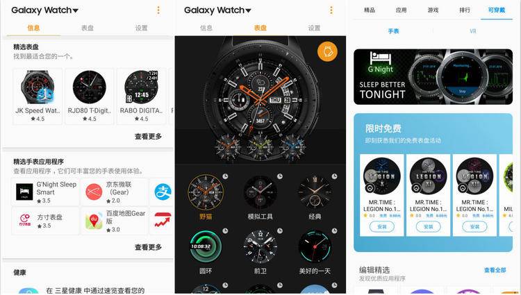 随着手表命名的改变,手机端的 app 也更名为「Galaxy Wearable」。在 app 内可以看到表盘相关的内容占了很大的比重,这也是目前三星可穿戴软件生态的现状,表盘的质量很高,但第三方软件的数量还很有限。随着新系统的到来,原先的语音助手 S Voice 也终于被 Bixby 所替代。从我们的实际体验来看,手表端的 Bixby 和手机版相比还有差距,基本上还是以执行语音指令为主,少了一些趣味性的内容,之后还需要不断更新来提高它的可用性。