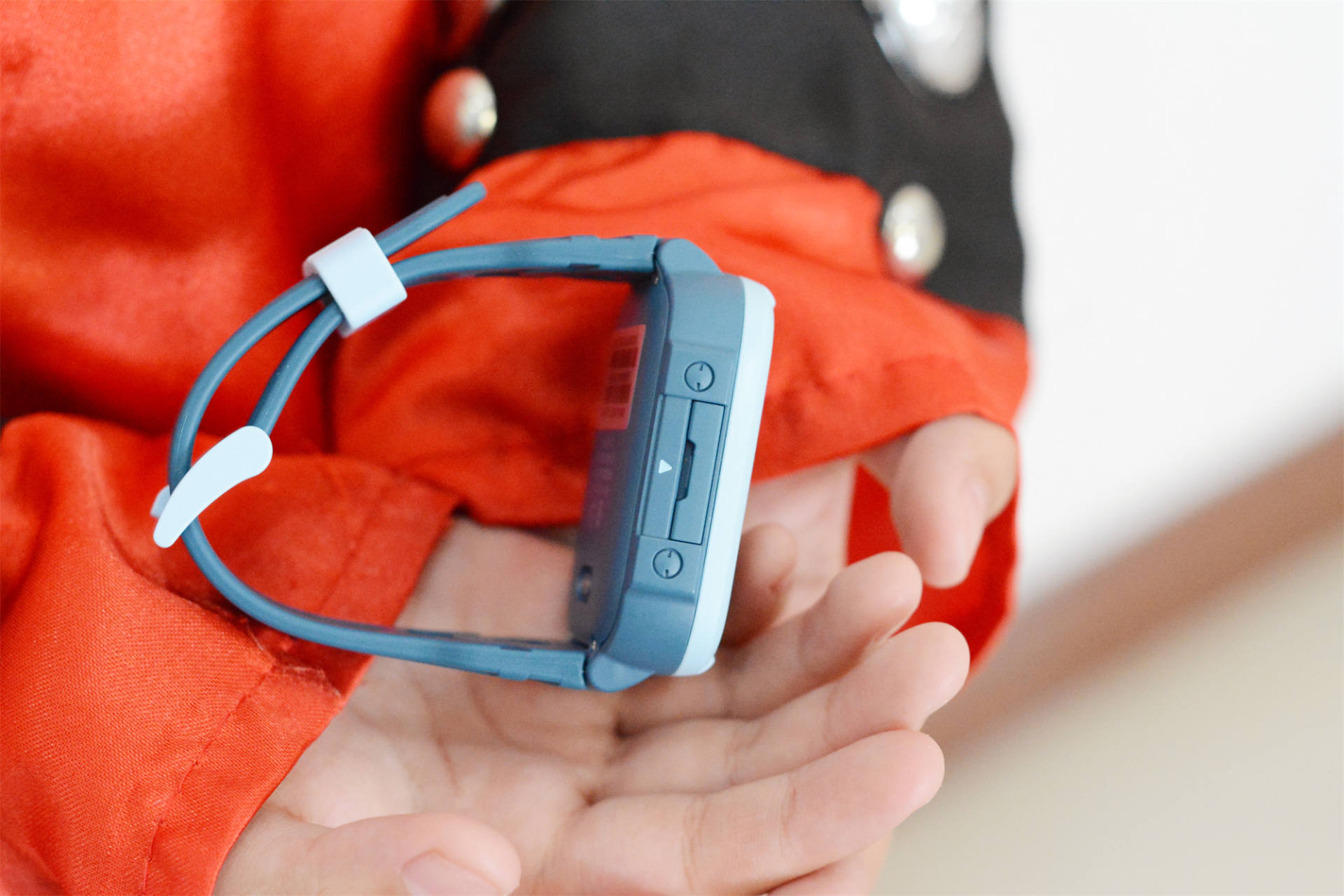 开机键和扬声器在一侧,卡槽在另一侧。操作除了开机键其他都依靠触屏操作。这点在设计上和成人的智能手表是一致的,不过它的受众是儿童,所以功能更强大一些。