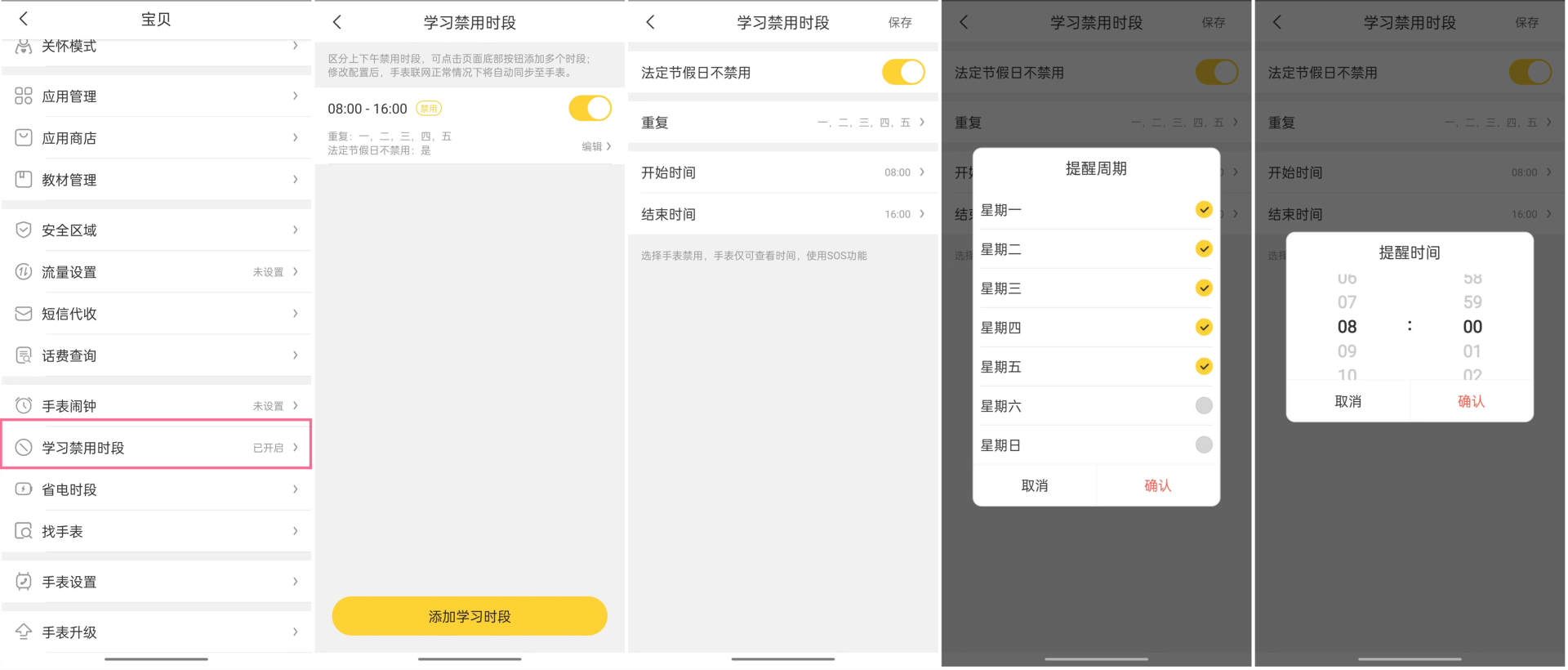 起初我并不希望他带手表上学,怕心思不在学习上了,不过通过学习禁用时段设置好时间后,不超过3天他就没心思天天盯着手表了,毕竟学习时间最多看看时间,还可以给我这个管理员打电话,其他的么,不要想,死心就好了。