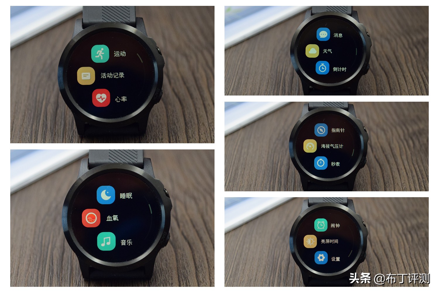 在主界面短按侧面的功能键,可键入到菜单栏,共设置了15个选项,除了运动、心率、睡眠、血氧等运动相关功能,还内置了天气、闹钟、秒表、指南针、海拔气压计等功能,户外运动还是很实用的。