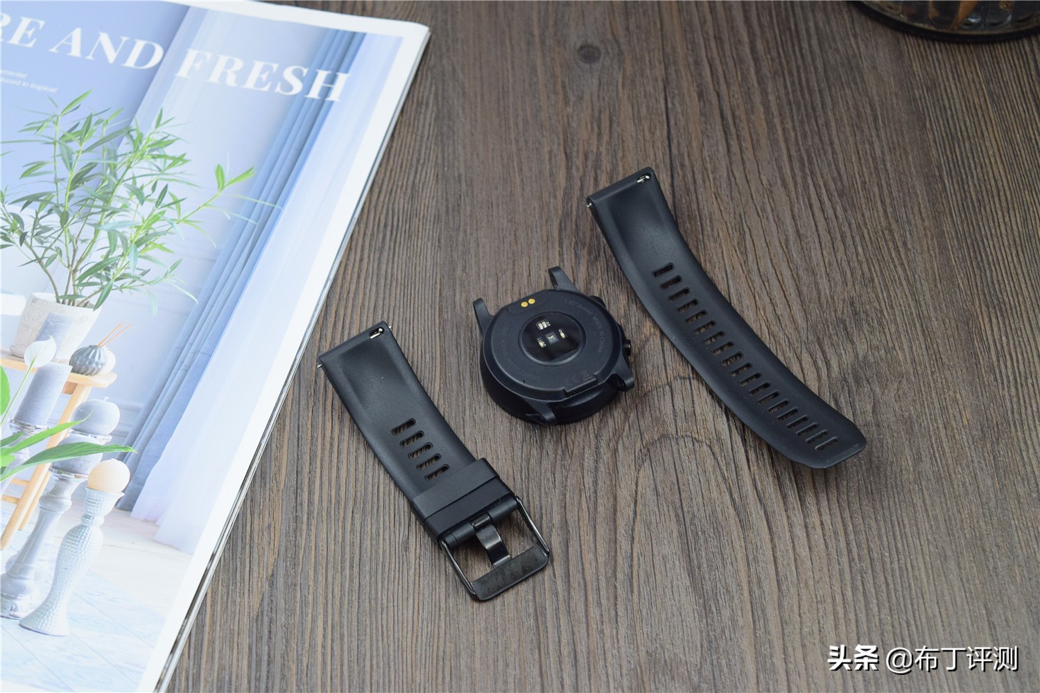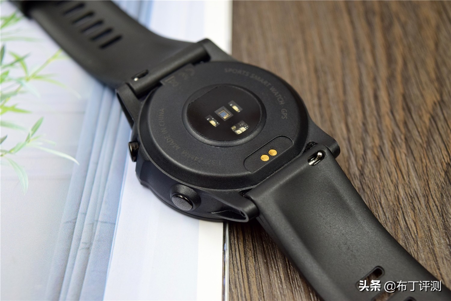 手表的背面中间位置是传感器,采用EEG-ECG光学心率传感器融合技术,可以带来医疗级的体征监测,让测量数据精准度更高;在靠近下方的位置有2个金属触点,这是手表的充电接口,进行了防水处理。