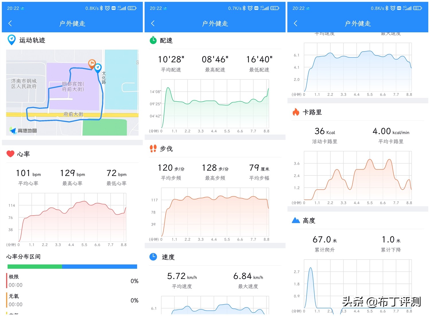 我再次通过“户外健走”进行体验,虽然整个运动距离只有850米,但从运动轨迹中可以看到,路线记录和实际路线十分一致,精准度很不错,而且对于运动过程中各项数据的记录和分析同样很详细。
