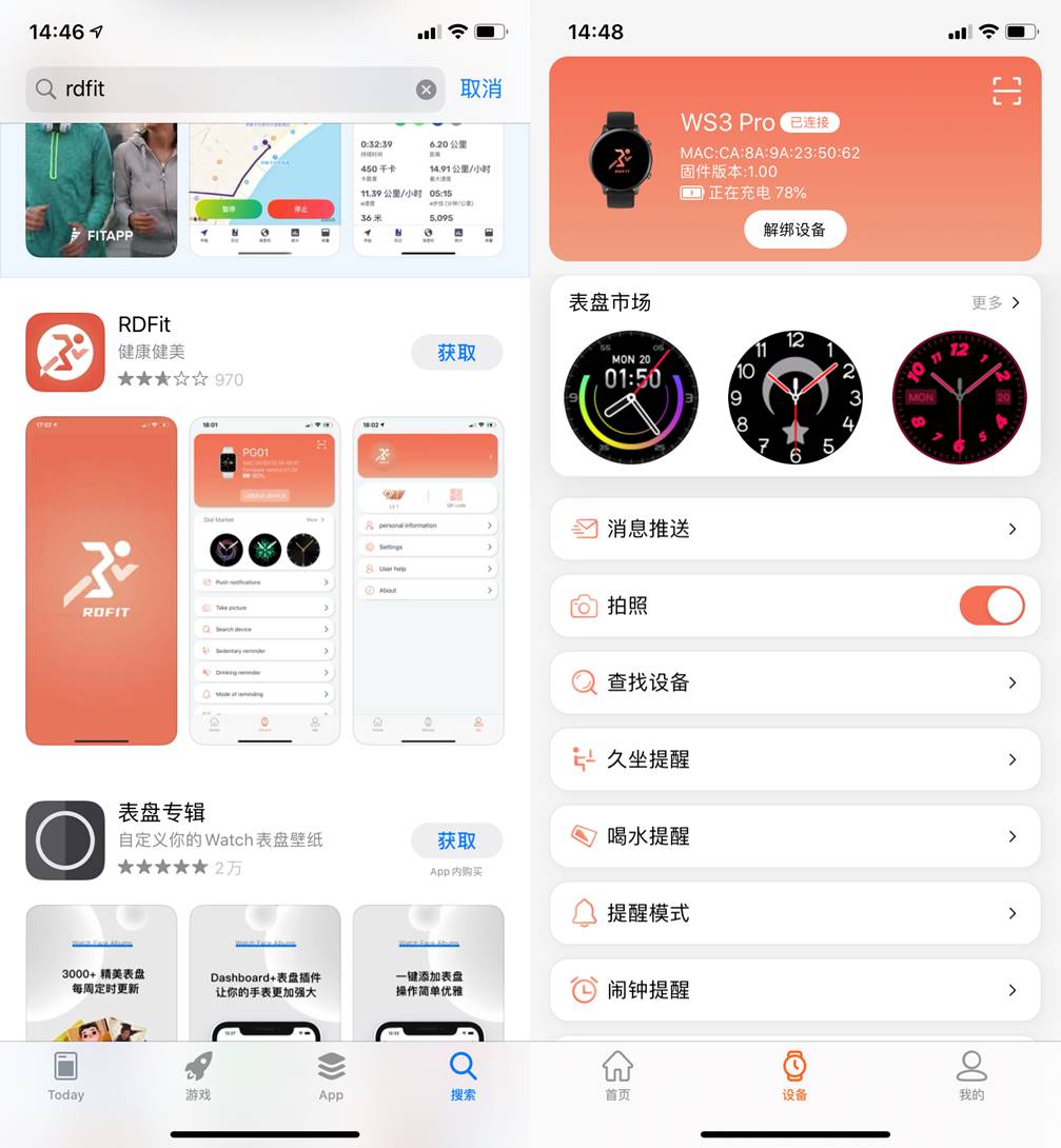 想体验全部功能需要下载一个专属的APP,RDfit这款软件也是华强北众多智能手表中常用的一个软件。连接好后,可以通过APP更换表盘,当然比如拍照控制、查找设备(双向的)、久坐提醒、喝水提醒、闹钟提醒等等这些基本智能手表的功能都是在的。