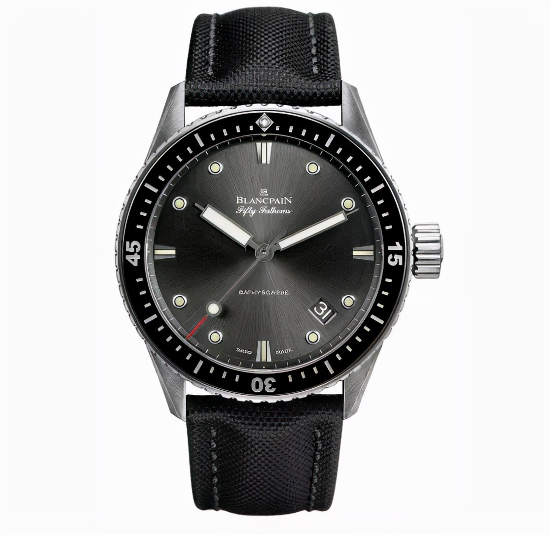 这是一枚宝珀五十噚系列5000-1110-B52A腕表,这枚腕表搭载自动机械机芯,表壳为缎面磨砂精钢材质,内嵌陶瓷,航海帆布表带,具有日期显示功能,表径43毫米,防水300米,参考价格77500元(以实际价格为准)。