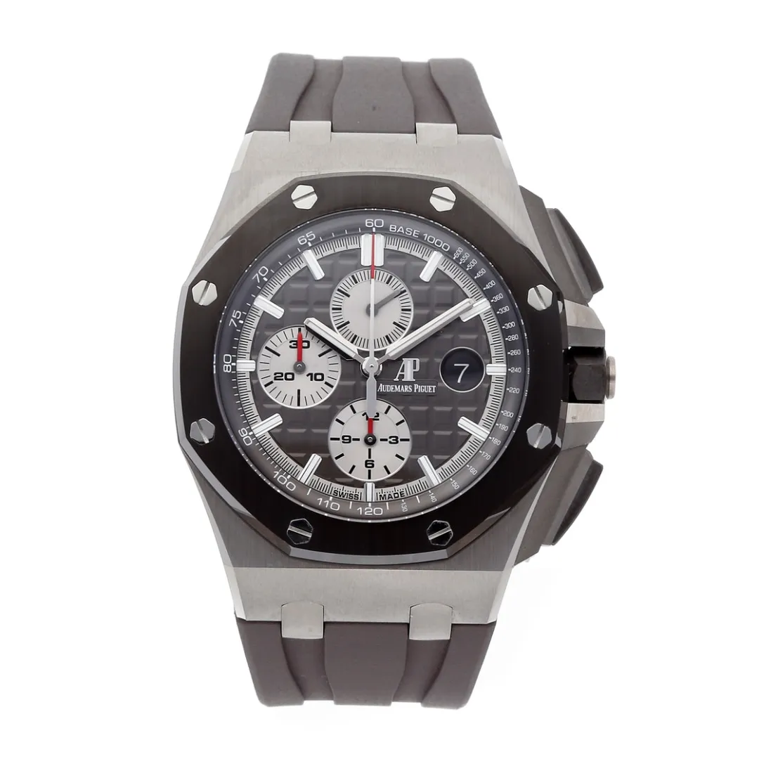这是一枚爱彼皇家橡树离岸型系列26400IO.OO.A004CA.01腕表,这枚腕表搭载自动机械机芯,表壳为钛金属材质,黑色陶瓷表圈,橡胶表带,具有日期显示和计时功能,表径44毫米,防水100米,参考价格269000元(以实际价格为准)。