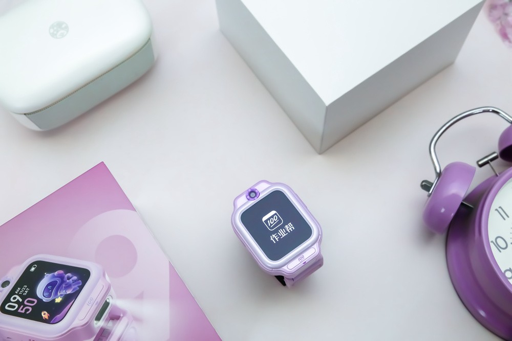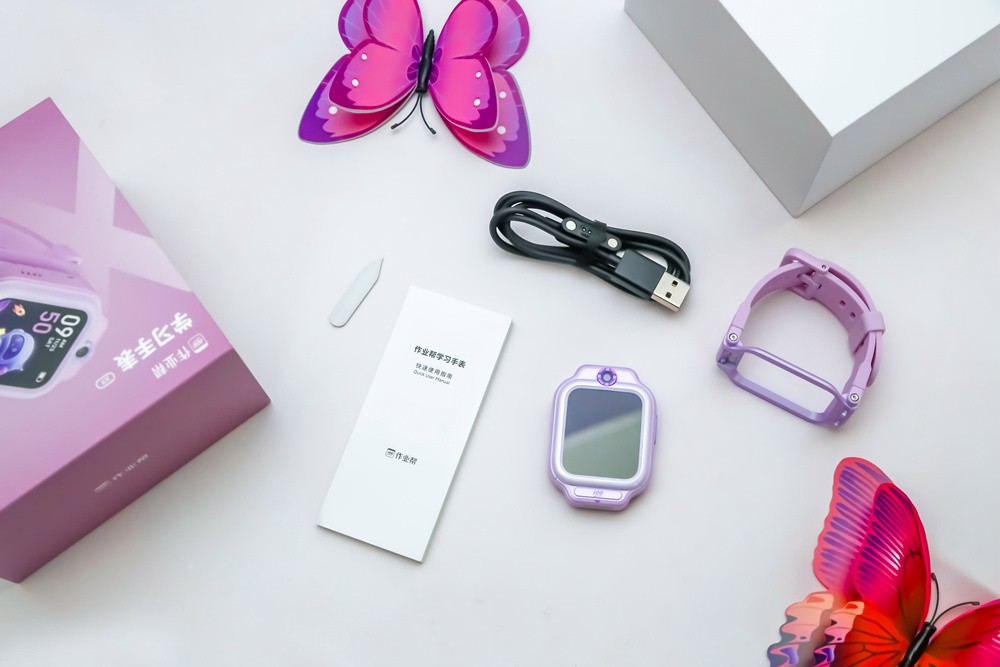 首先,还是按惯例来个简单的开箱及配件说明,目前作业帮这款学习手表推出了星空黑和追梦紫两款配色,相信家里是闺女的,都会喜欢这种梦幻粉嫩的紫色款吧。因为支持变身为智能“词典笔”功能,因此这款手表采用了卡扣式表体表带可拆卸的特别设计,额外还配备有一条磁吸充电线和一个取卡针。