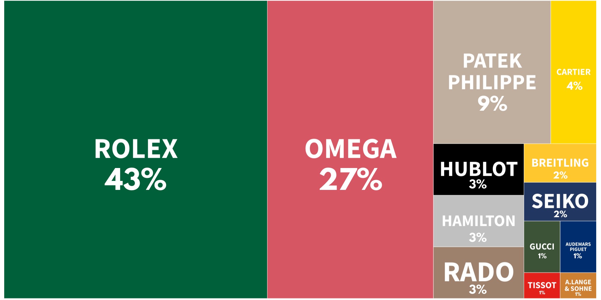 当我们按百分比细分数据时,我们发现劳力士是世界上几乎一半国家的首选。欧米茄是第二受欢迎的品牌,但其受欢迎程度仍然与劳力士的有三倍的差距。