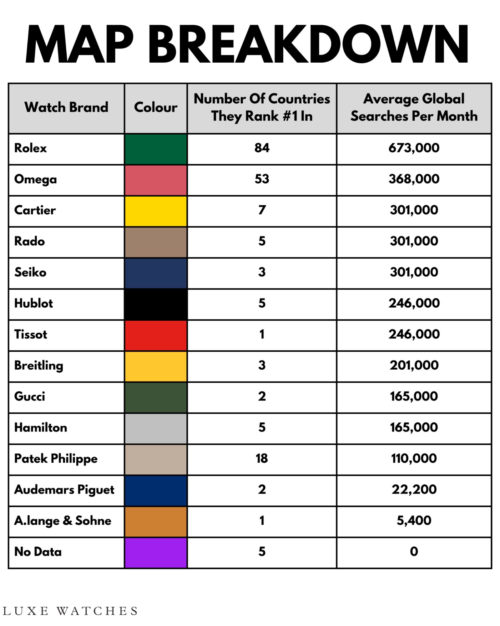 每个人都听说过劳力士、欧米茄,但哪个手表品牌最受欢迎?我们深入研究了这些数据,以找出哪个奢侈手表品牌在世界各国最受欢迎。通过检查人们在不同国家和地区搜索哪些品牌,一个有趣的模式出现了——让我们来分解数据。