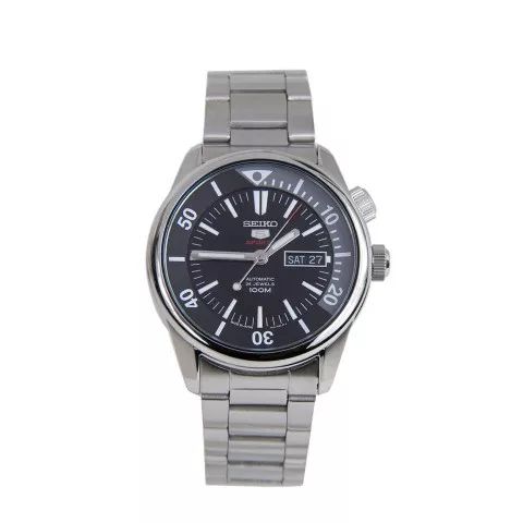 这款Seiko精工5号自动机械男表,采用抛光不锈钢表壳及表带,矿物强化玻璃表镜,黑色不锈钢表盘,银色时针带夜光显示,条形刻度,3点钟位置设有星期、日历显示。