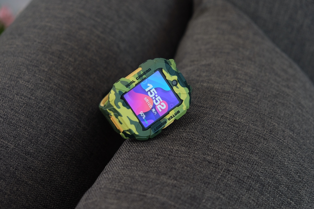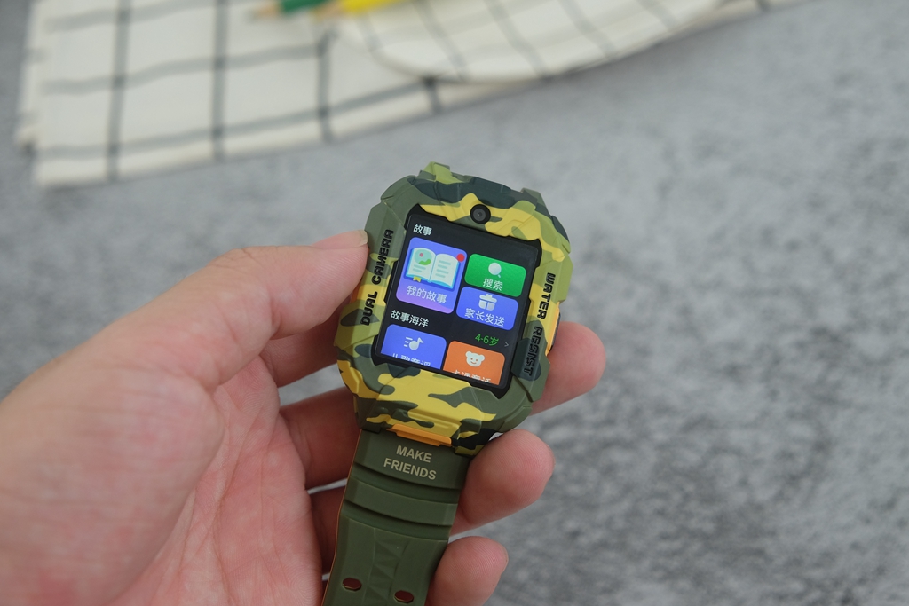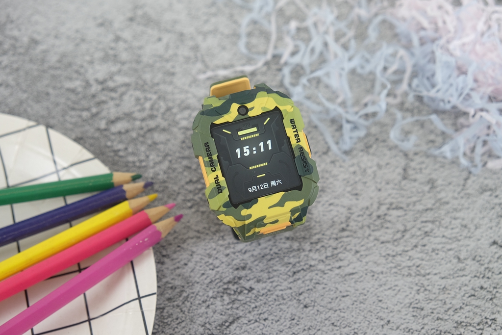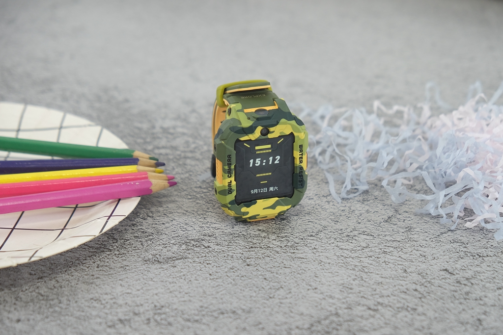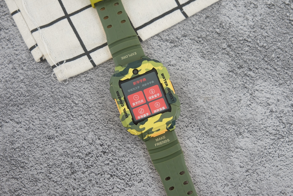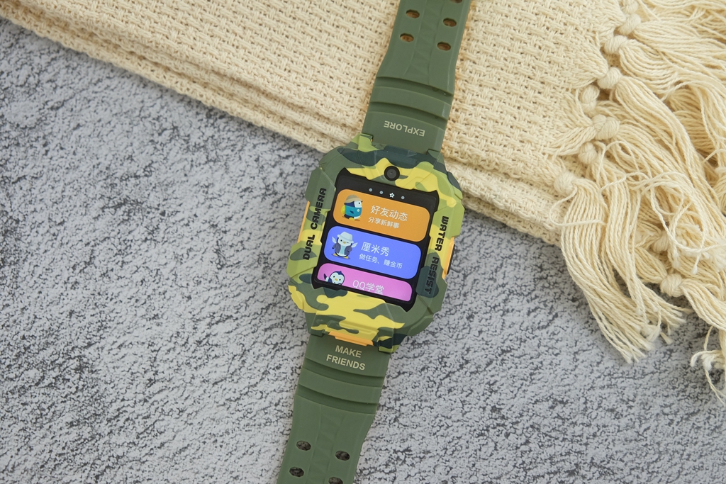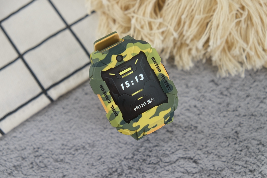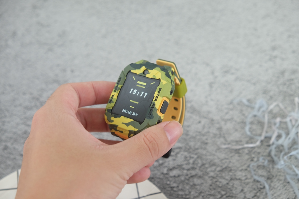 有一些细节,通过图片或是渲染图很难察觉到,只有真的拿到手表真机,才能发现出这种改进。一般的儿童手表都会直接采用方正设计,而它则采用上下两边切平,中间平滑切面贯穿上下设计。直白地说,可以给屏幕起到更好地保护作用,同时增加了凌厉视效,也让迷彩的辨识度提升,确实是一个很不错的改进。