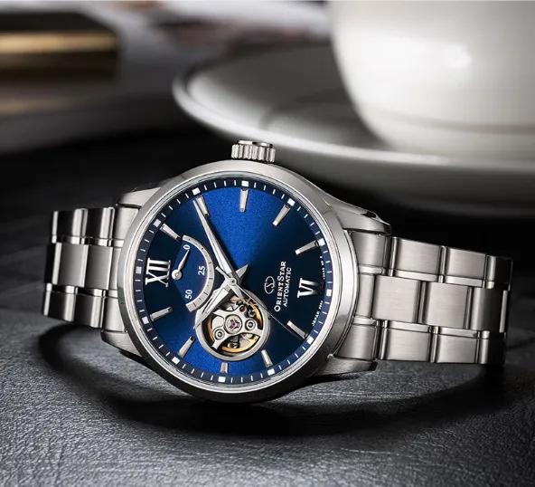 二号选手,东方星(OrientStar)。这个是日本爱普生集团旗下品牌,我看过这个牌子的表款都不错,颜值都挺在线的。这个名仕系列 RE-AT0001L00B 自动机械男表,深蓝色表盘很有设计感。同样是商务休闲都适合的单品。