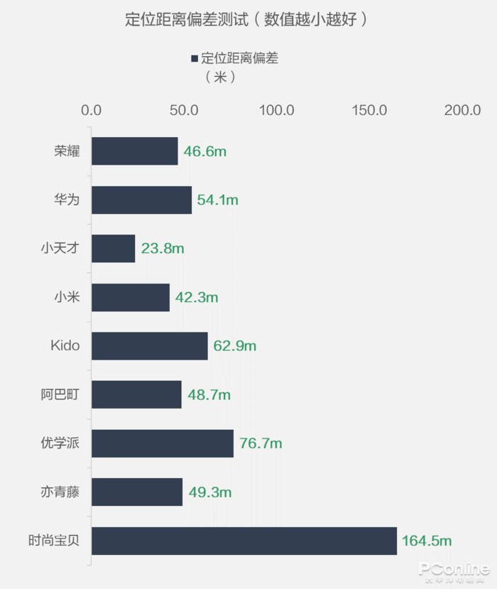 定位距离偏差方面,小天才以23.8米领先,华为、荣耀、小米、阿巴町、亦青藤偏差不大,时尚宝贝平均偏差达到164.5米,这都隔了好几个门口了吧……