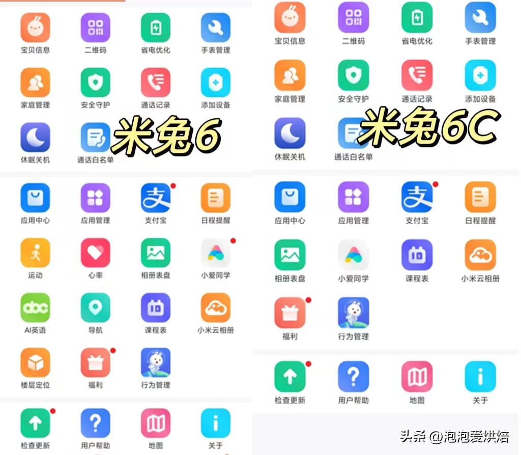 米兔6儿童手表在功能上比6C更加丰富了一些,如下为对比图,在楼层定位、AI英语、运动及心率方面都有了突破。