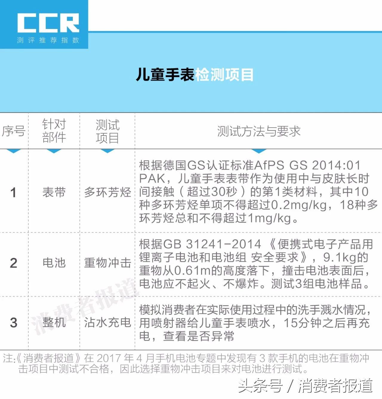 结果显示,6款儿童电话手表全数通过3项测试。检测机构并未在6款产品的表带上检出18种多环芳烃;6款产品的电池经过重物冲击实验后,不起火,不爆炸;整机沾水后充电,表现正常。