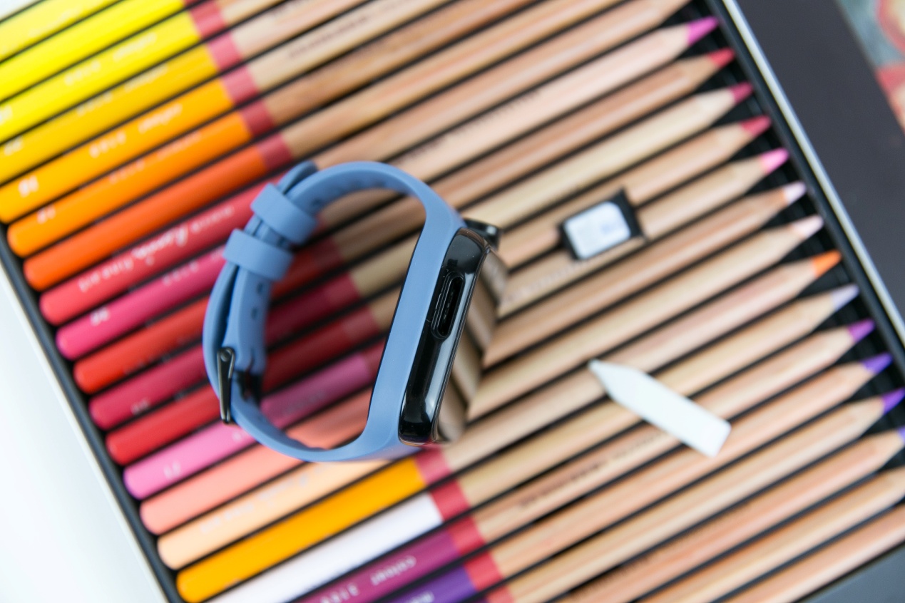 表盘背部是金属充电触点,采用磁吸方式连接数据线。蓝色表带以嵌套在黑色表盘之外,感觉为可更换设计,但自己动手的话我并没发现该怎么拆。
