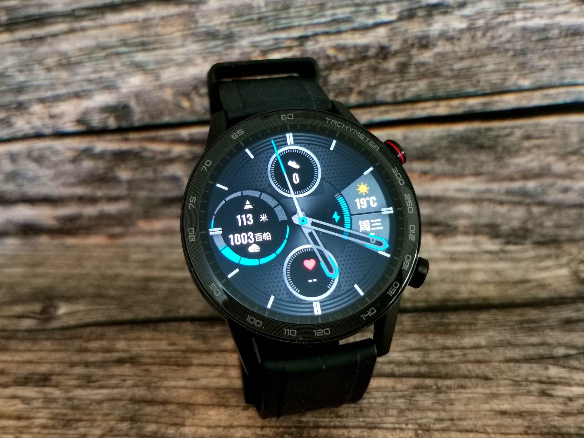圆形手表的表盘也更加丰富多样,既可以选择传统的指针式表盘,也可以选择年轻现代化的数字表盘。荣耀手表2还支持待机表盘功能,如开启这个功能再配个传统样式的指针表盘,可以以假乱真传统手表了。不过待机表盘功能由于需要屏幕常亮,会大大降低续航。如果比较注重续航,又要看时间方便,用抬腕亮屏功能即可。(图中另一款手环为荣耀手环5i)
