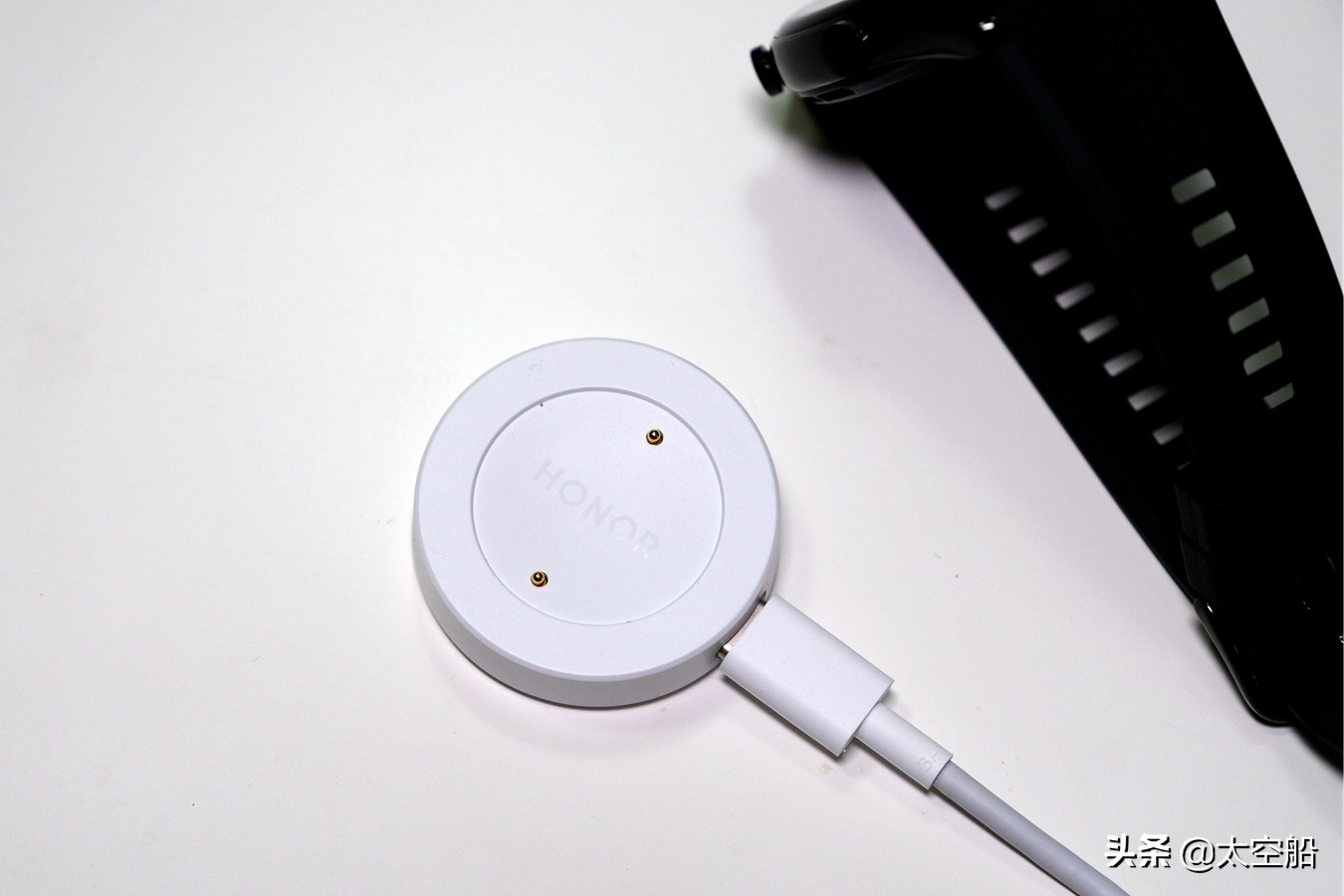 充电底座设有Type-C接口,并且采用了磁吸式设计,当靠近手表底壳时会自动与金属极片吸附在一起并开始充电,而且普通的移动电源也可以为它充电。