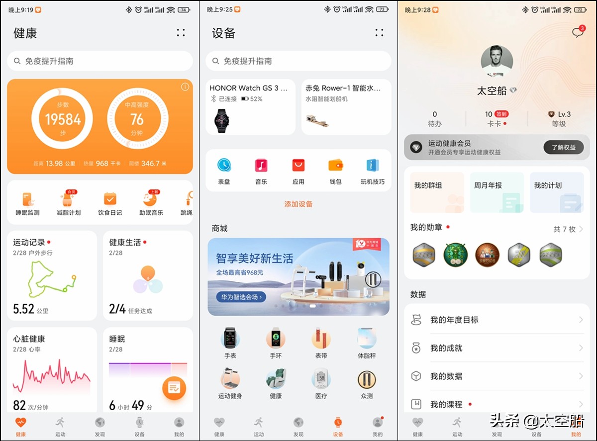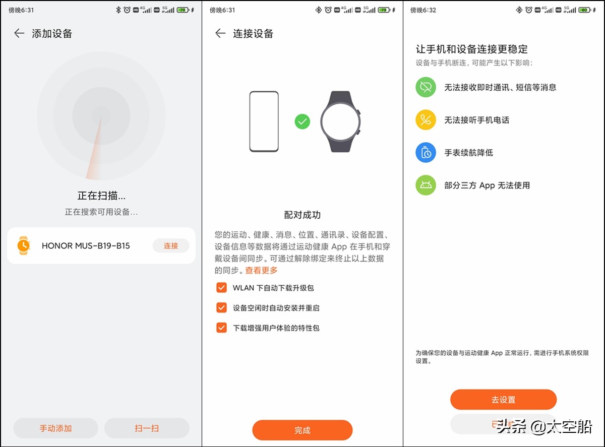 荣耀手表GS3配套手机客户端是运动健康APP,初次运行需要注册一个账号登录,然后进行设备添加操作,这个步骤有向导式引导,所以比较简单。