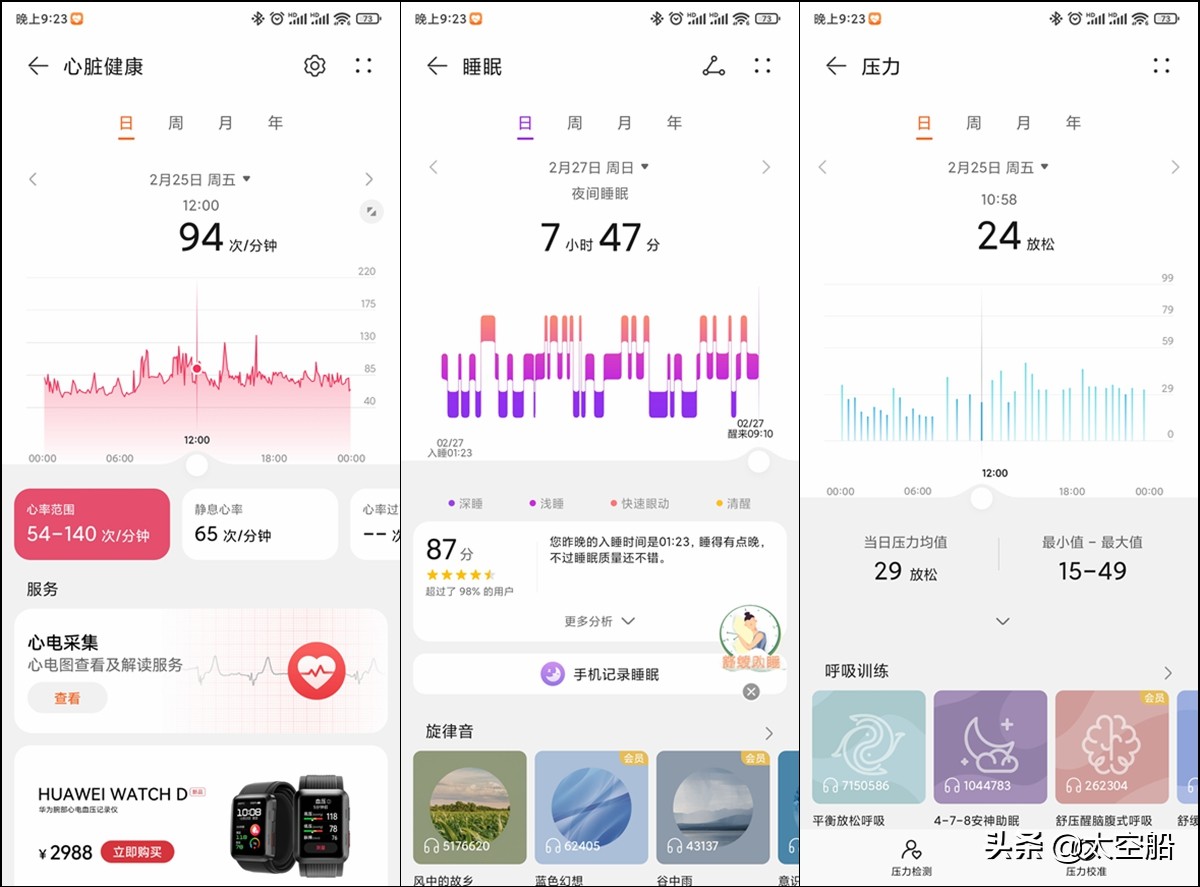 除了运动记录外,心率、睡眠、压力等等监测的历史数据也可以查看,并支持以日、周、月和年为单位进行查看,同样是图标形式呈现出来,而且还会给予相应的分析和评估。