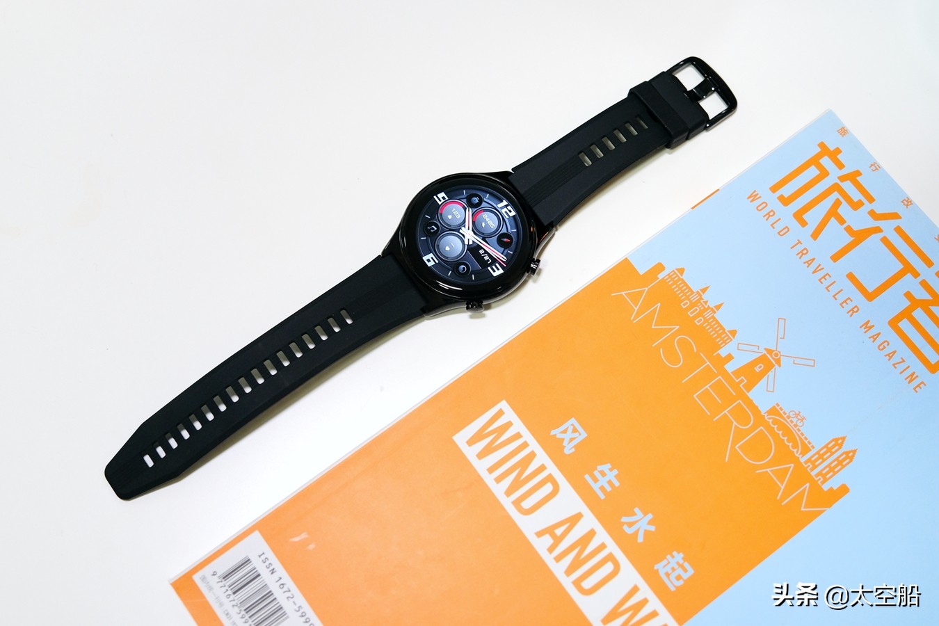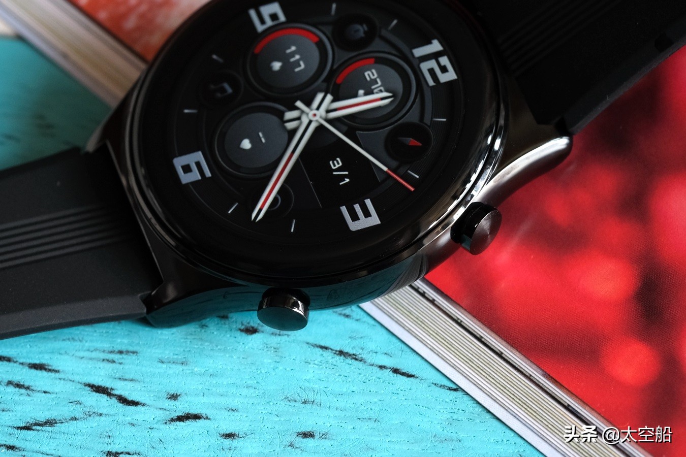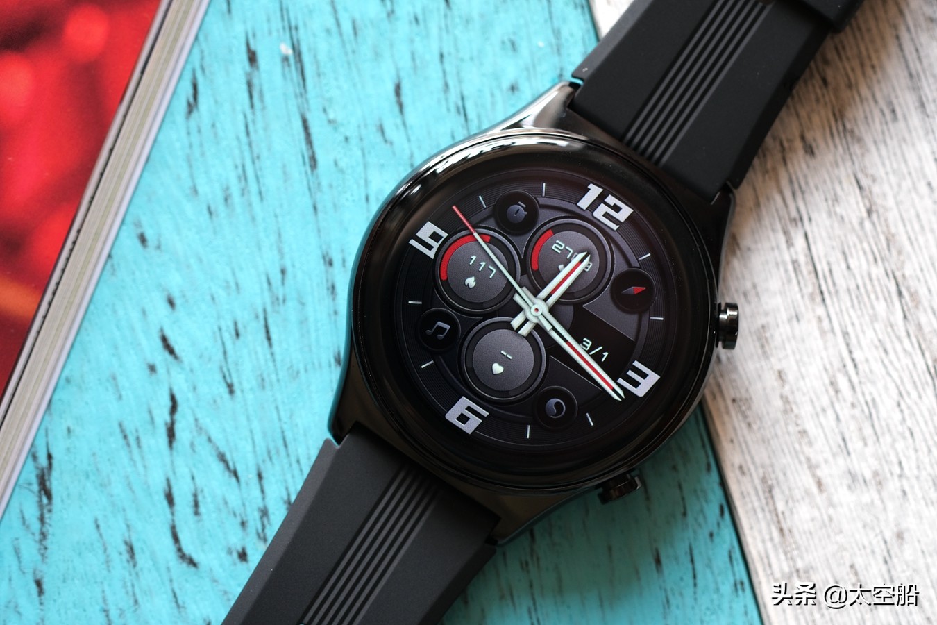 初见荣耀手表GS3,笔者就被它简约时尚的外观设计给吸引住了。它采用常见的正圆表盘设计,黑色316L低碳精钢表圈搭配一块1.43英寸的AMOLED彩色圆屏,表面覆盖着一层3D超曲面玻璃,看上去更具档次感。表盘直径为45.9mm,厚度也仅10.5mm,重量也只有44克,非常适合亚洲人士的手腕佩戴。