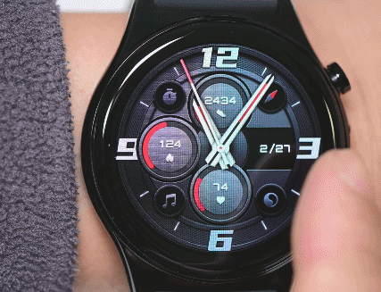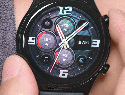 荣耀手表GS3配备的AMOLED彩色圆屏的显示效果非常出色,它的分辨率高达466 x 466,326的PPI值达到了视网膜分辨率级别,100%NTSC的屏幕色域和最高1000nite亮度,无论是图案还是文字,看上去都十分清晰细腻,色彩也比较艳丽。