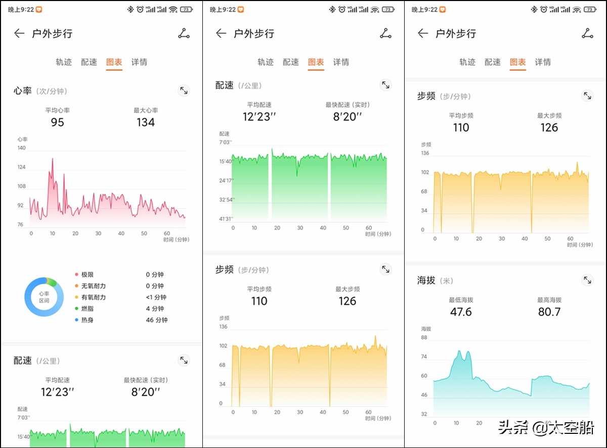 笔者选择多数人都喜欢的户外步行测试,在运动过程中,荣耀手表GS3会自动对心率、配速、距离、时间等数据进行实时监测,得益于高清大屏幕出色的显示效果,手表上的运动数据看得非常清楚。每当运动达到一定的小目标,手表还会通过震动和语音进行提示。每次运动完都可以通过手表或者手机APP查看详细的运动记录,各项监测数据都较为详细,各种数据都以图表形式呈现,非常直观。