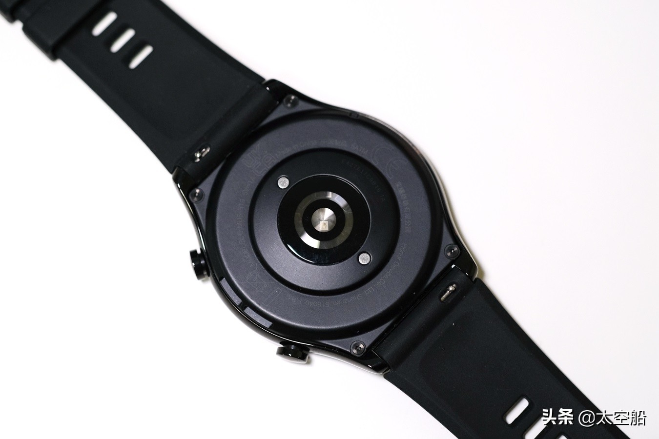 手表的底壳为ABS塑料材质,做了亲肤涂层处理,触感还是不错的。在底壳的中间除了两个金属充电极片外,还有搭载了PPG生物数据传感器。和之前的荣耀手表不同的是,荣耀手表GS3是荣耀首款搭载心率监测解决方案“8 通道心率 AI 引擎”的智能手表,无论是日常佩戴还是运动过程,对心率和血氧的监测更加精准。
