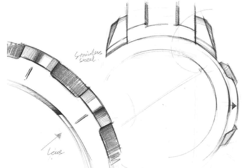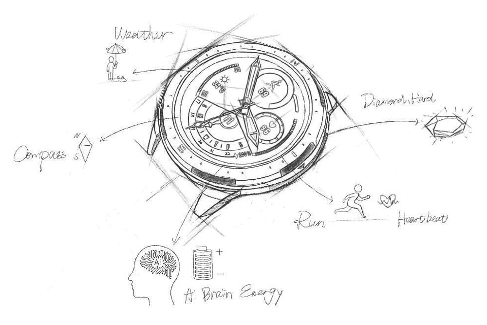 第二件草图(如上图)更详细地展示了表圈和按钮,它有些仿古,表圈由不锈钢材质打造,和此前的荣耀 MagicWatch 2、Ticwatch S2、Suunto 7等智能手表风格大为不同。