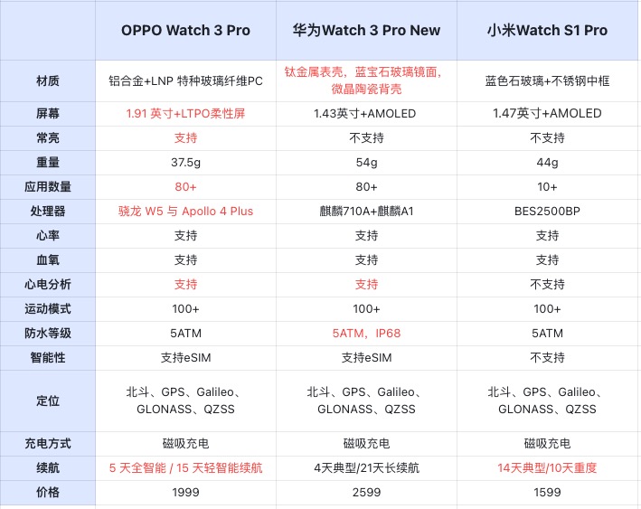 (OPPO Watch 3 Pro、华为Watch 3 Pro New、小米Watch S1 Pro)