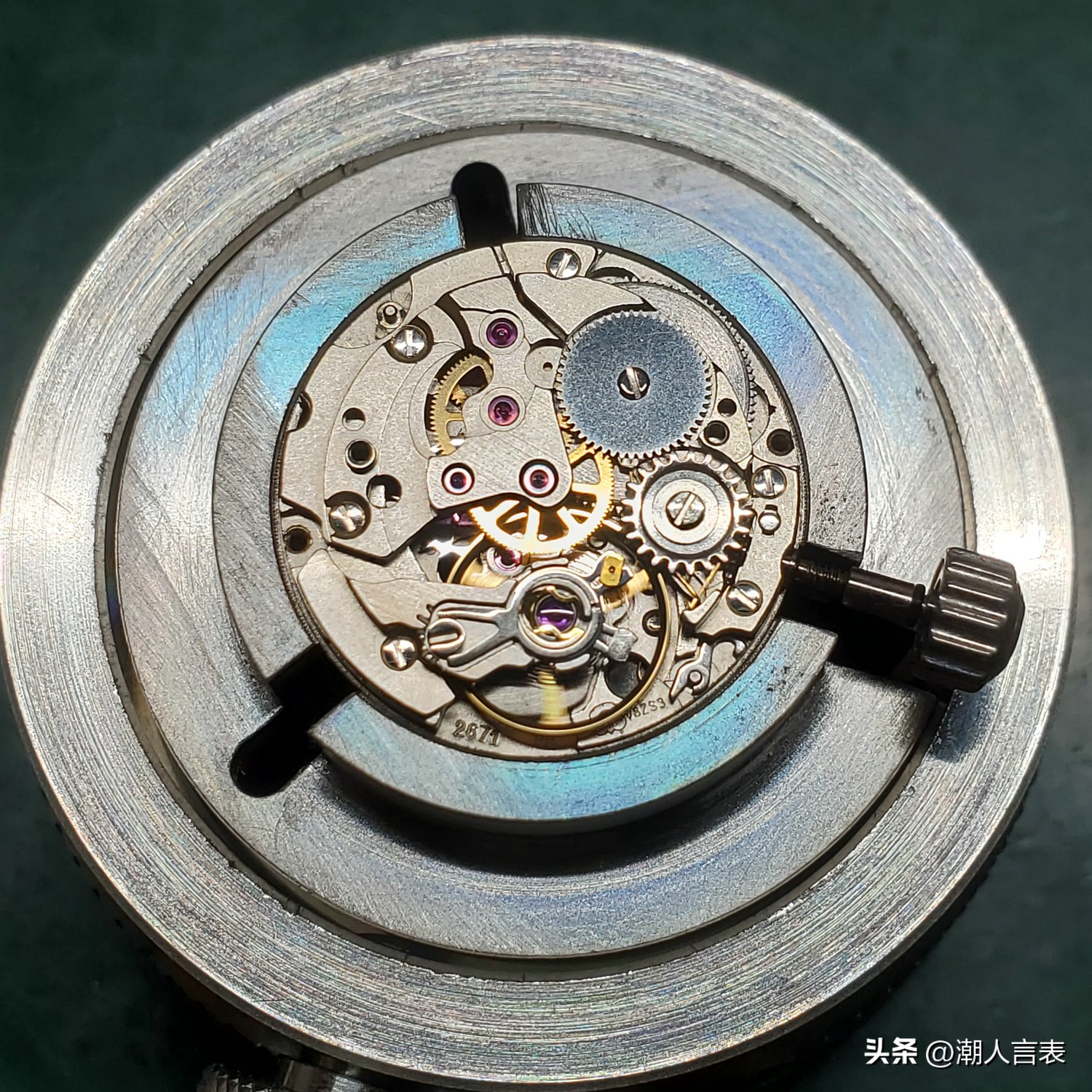 2671机芯有点类似2824迷你版,有25颗宝石、快速日历调整和秒停功能。上链效率非常高,一般6小时就可以上满条,摇表器上满条速度更快。这种机芯比较容易出现的问题是小钢轮的顶头簧在扭力比较大的时候容易折断。