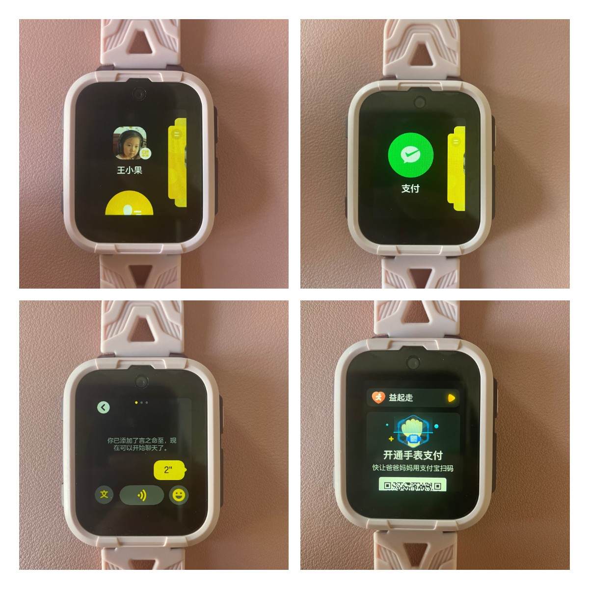 我们可以看到儿童手表的微信App是黄色为主题的,不仅有跟手机App版微信一样的通讯录,而且还能支付,设置支付限额可以控制孩子每天的零花钱。用微信发消息是可以发语音、文字和表情的,文字是通过语音转换过去的。同样的360儿童电话手表10X还能登陆支付宝,也可以为孩子设置零花钱。但是这些支付方式都是二维码支付,不能主动扫码,所以孩子还得去正规的连锁超市消费。