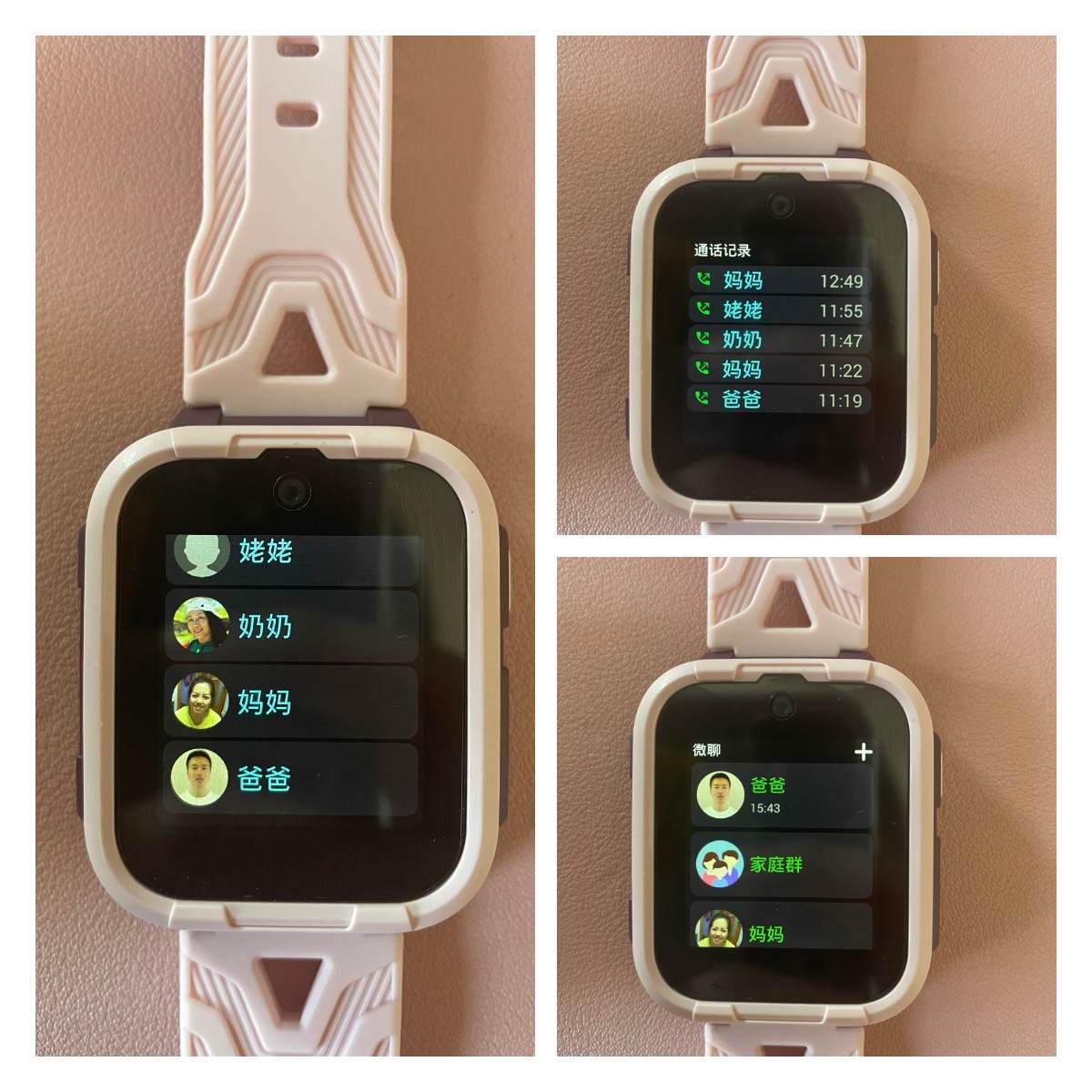 360儿童电话手表10X直接插入全网通的4G电话卡,这样对于打电话而言就成了比较简单的事情。同时360儿童电话手表10X采用了一个500万像素的摄像头,拍照还是比较清晰的。所以用360儿童电话手表10X高清视频通话还是很给力的,手表1.52寸的大屏在儿童手表圈里算是顶级了,孩子肯定能看清家长的脸,我们三口人拍了照片,感觉分辨率也很高。