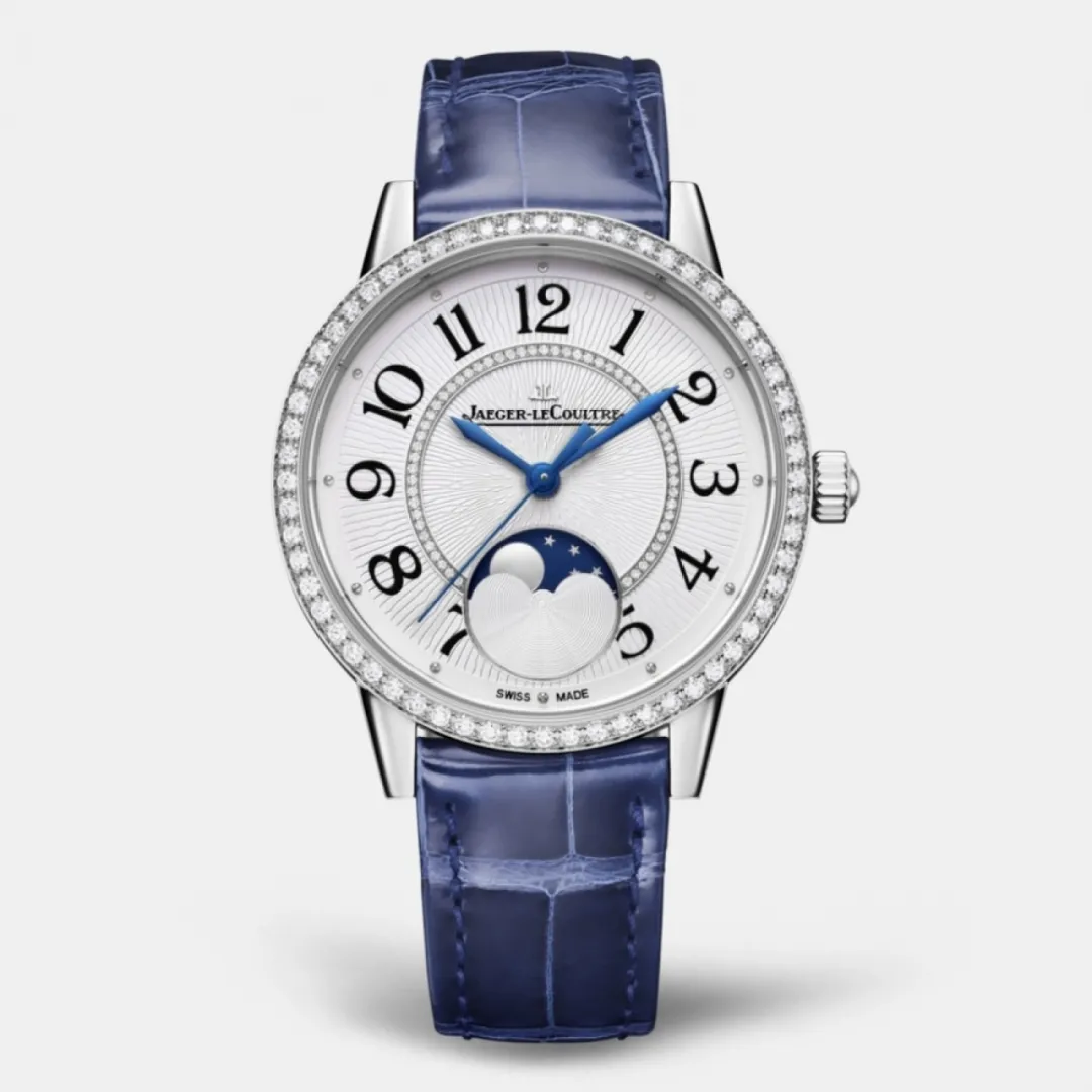 这是一枚积家约会系列3578430腕表,这枚腕表搭载自动机械机芯,表壳为精钢材质,表圈镶嵌了60颗紧密排列的明亮式切割钻石,扭索饰纹表盘,内表盘和谐对称的点缀了47颗尺寸较小的美钻,具有月相显示功能,表径34毫米,防水50米,参考价格132000元(以实际价格为准)。