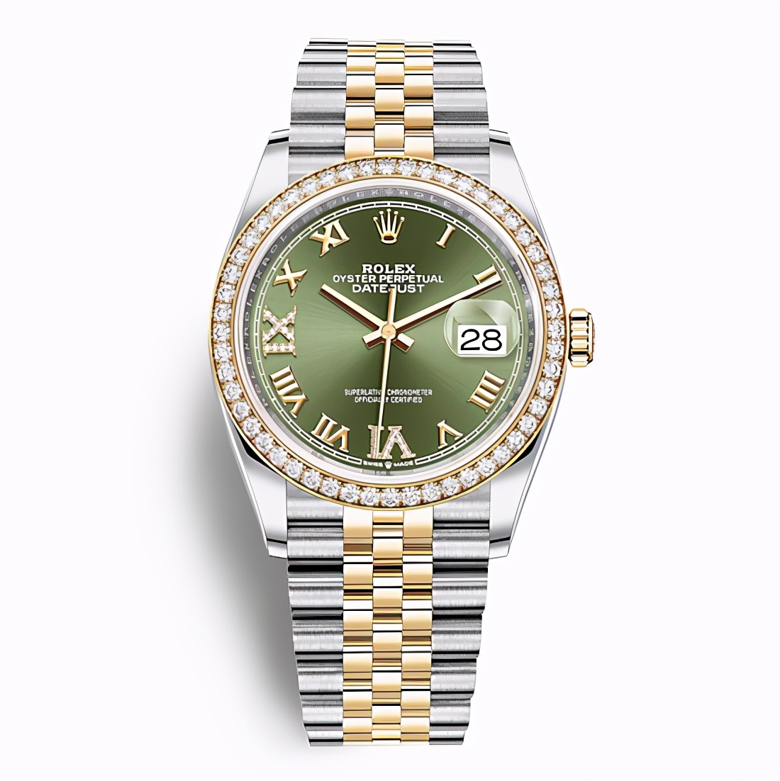 这是一枚劳力士日志型系列m126283rbr-0011腕表,这枚腕表搭载自动机械机芯,表壳和表带为间金材质(904L不锈钢/18ct黄金),表圈镶钻,具有日期显示功能,表径36毫米,防水100米,参考价格164600元(以实际价格为准)。