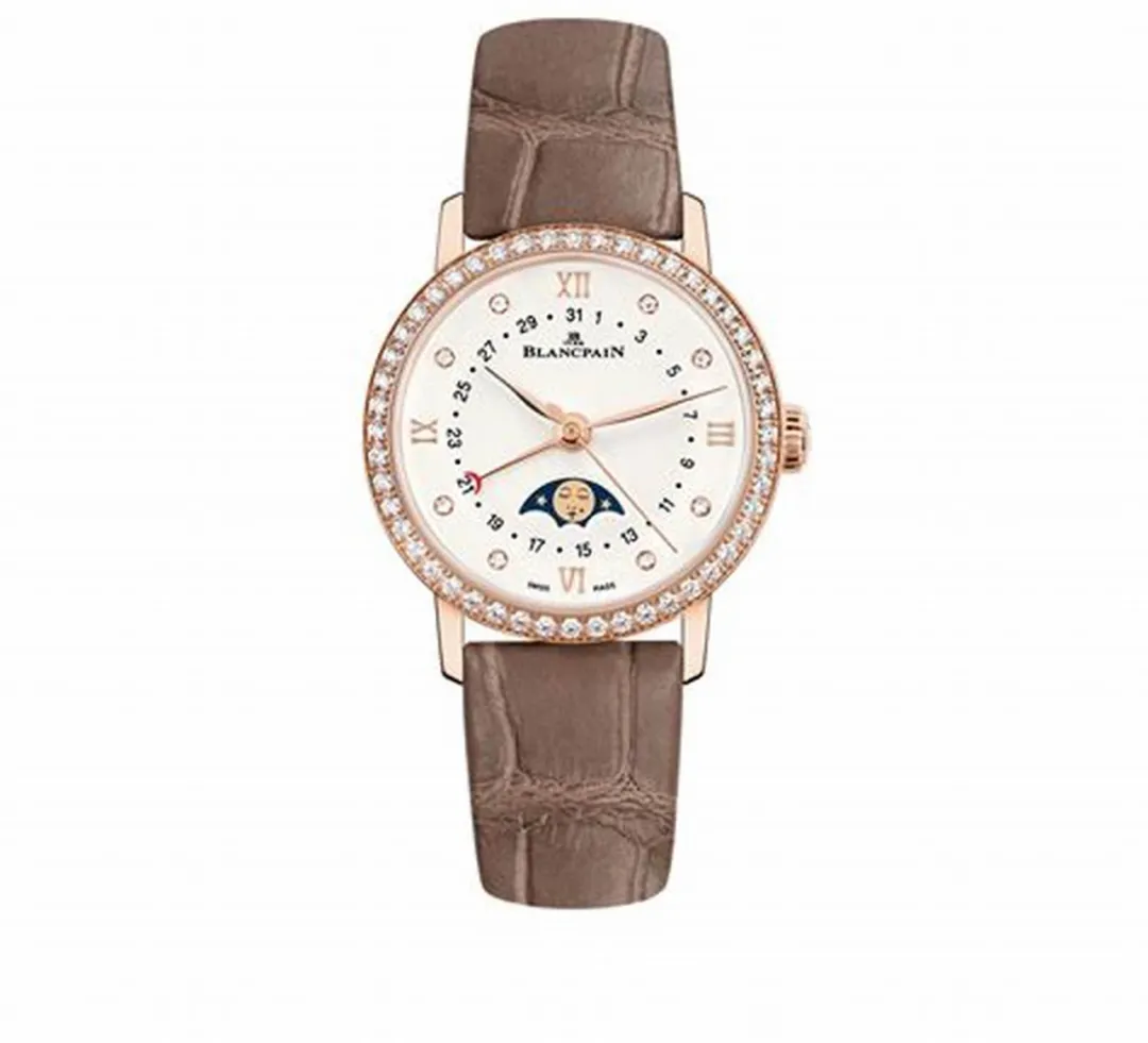 这是一枚宝珀经典系列6126-2987-55A腕表,这枚腕表搭载自动机械机芯,表壳为18k红金材质,表圈镶嵌一圈美钻,短吻鳄鱼皮表带,内衬alzavel小牛皮,具有日期显示和月相显示功能,表径33.2毫米,防水30米,参考价格157500元(以实际价格为准)。